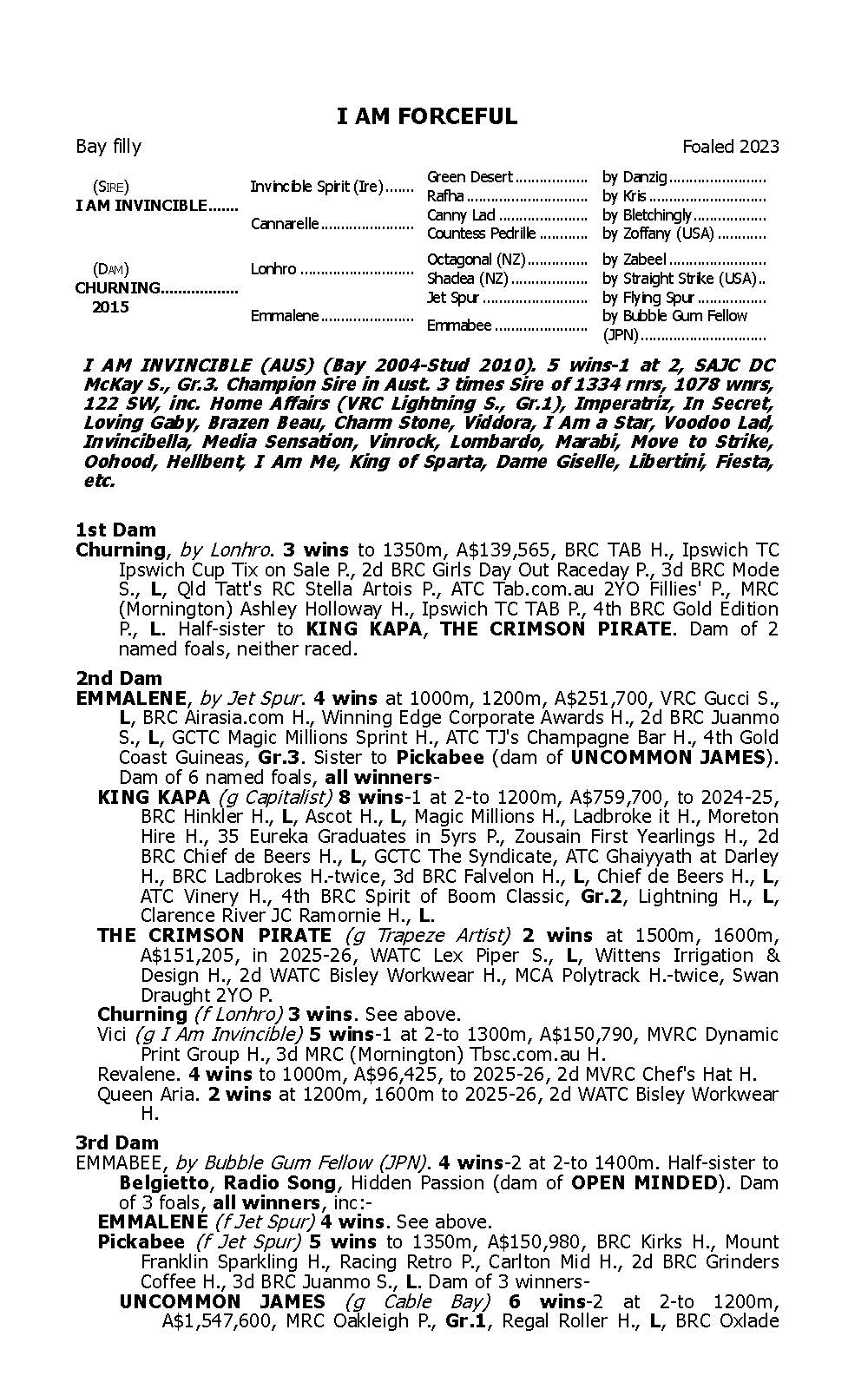 As highlighted above, 3yo gelding The Crimson Pirate is a half-brother to Churning, and she is the Dam of our filly I AM FORCEFUL. The additional Bold Uppercase Black Type close-up in the pedigree page is a very nice commercial result.